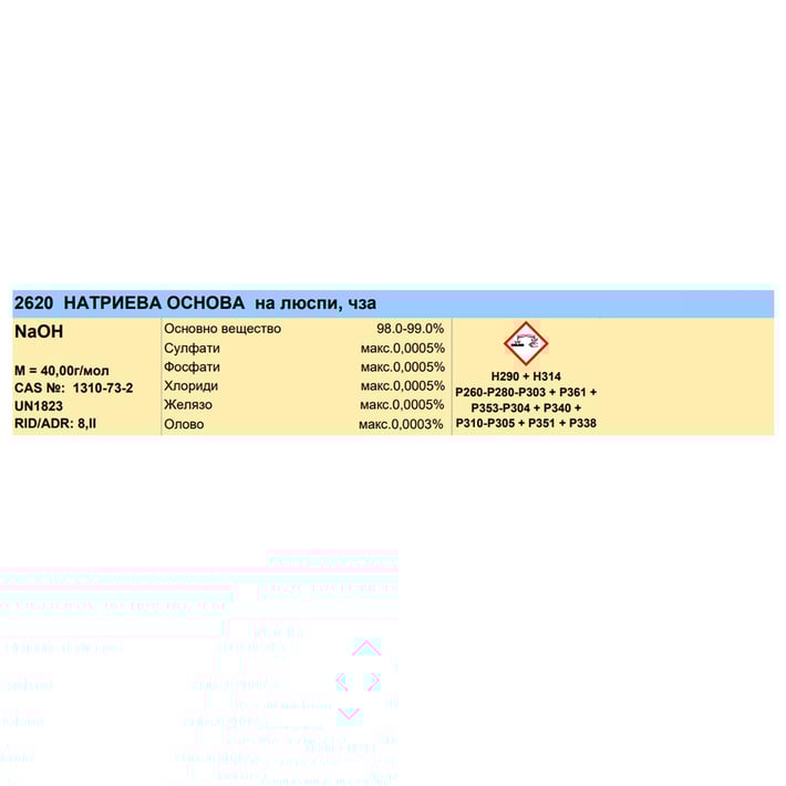 Натриева основа на люспи (NaОН), чиста за анализ.