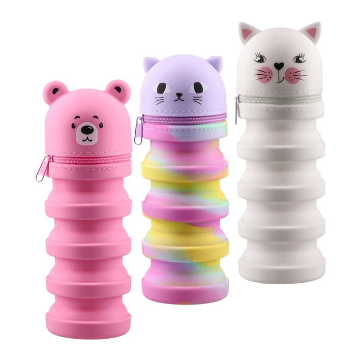 Забавен и практичен вертикален силиконов несесер Goommy, създаден специално за деца. Изработен от мек и гъвкав силикон, той е издръжлив, лесен за почистване и приятен на допир. Оригиналният дизайн с герои го прави любим аксесоар за училище и свободното време.Вертикалната форма спестява място в раницата и позволява удобно подреждане на моливи, химикалки и други дребни принадлежности.Размери: 19.5 x 6.5 x 6.5 cm.
