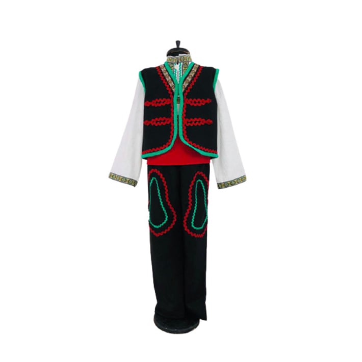 Мъжката народна носия се характеризира с бяла риза, вълнен елек или сако и широки панталони, често вълнени и цървули. Жилетката или сакото обикновено са украсени със сложни бродерии и метални копчета. Мъжете също носят калпак, често изработен от вълна или филц, украсен с цветна бродерия.