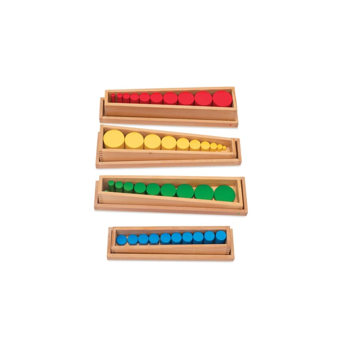 Размерът им (диаметър, височина) намалява или се увеличава. Първата кутия съдържа червени цилиндри - височината им е една и съща, но диаметърът на основите им намалява.