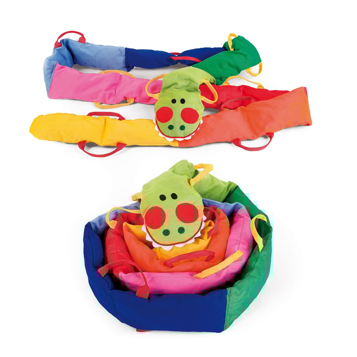 Голямата гъсеница е изработена от мека материя, в различни ярки цветове. Разполага с 16 броя дръжки и е идеална за децата, като насърчава ролевите и екипни игри.