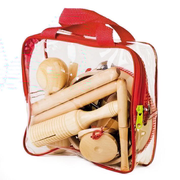 Комплектът съдържа 12 музикални инструмента: барабан със звънци (O 21 cm); 2 броя дървени маракаси (L 15.2 cm); триъгълник (D 10 cm); дървена дръжка с 5 камбани (10.5 х 8.5 cm); 2 броя кастанети (D 5.8 cm); чинела (ø 6 cm) с дървена пръчка; гуиро (L 20.5 cm).