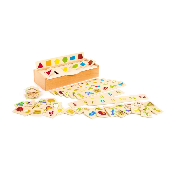 Комплектът съдържа всичко необходимо за насърчаване на фината моторика при децата, разпознаватето на различните цветове, форми, цифри и предмети от ежедневието.