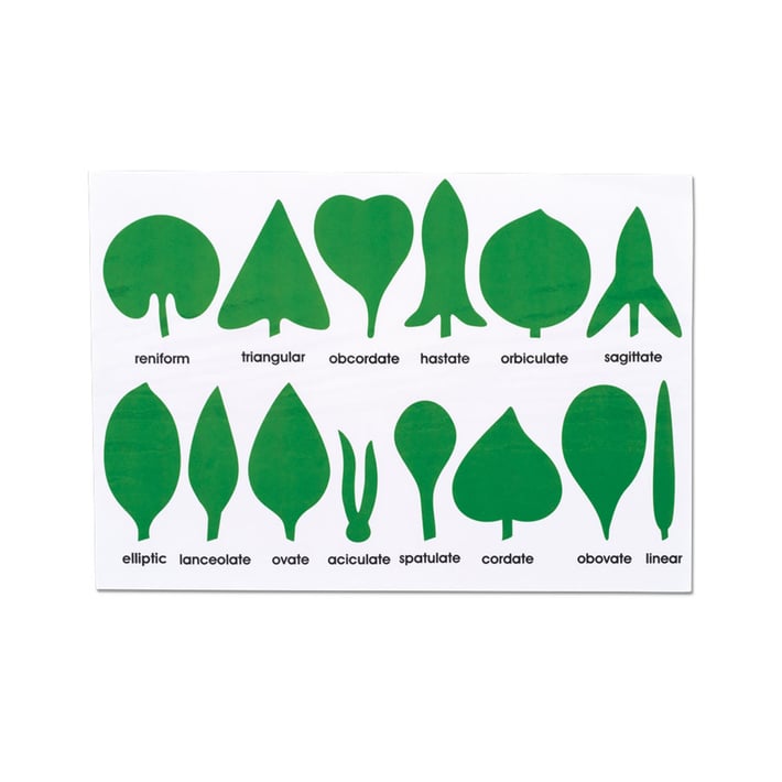 Съдържа 14 рисунки на листа с описания и форми: бъбрековидна, триъгълна, облистена, копиевидна,