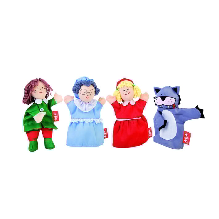 Комплектът меки кукли включва: Червената шапчица, бабата, ловеца, вълка.