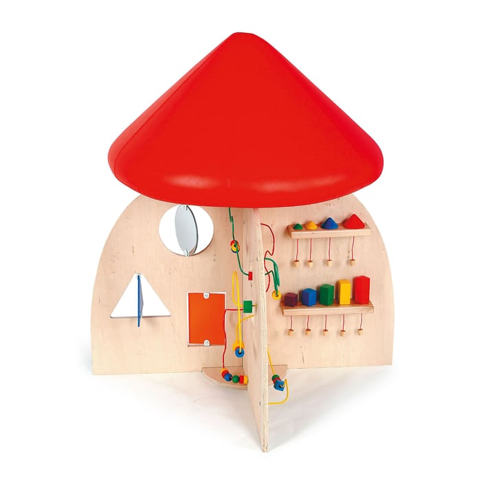 Кът за игра под формата на гъба, оборудван с множество манипулативни аксесоари, като пространствени лабиринти, дървени кубчета, дантелени гоблени и огледала.