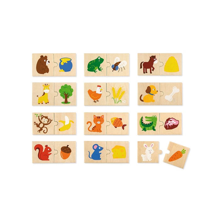 Пъзел-комплект, от който можете да съставите 12 двойки картинки с животни и техните любими храни.