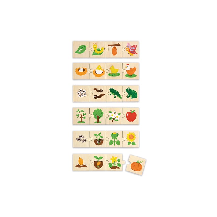 Пъзел, представящ циклите на развитие на растенията и животните.