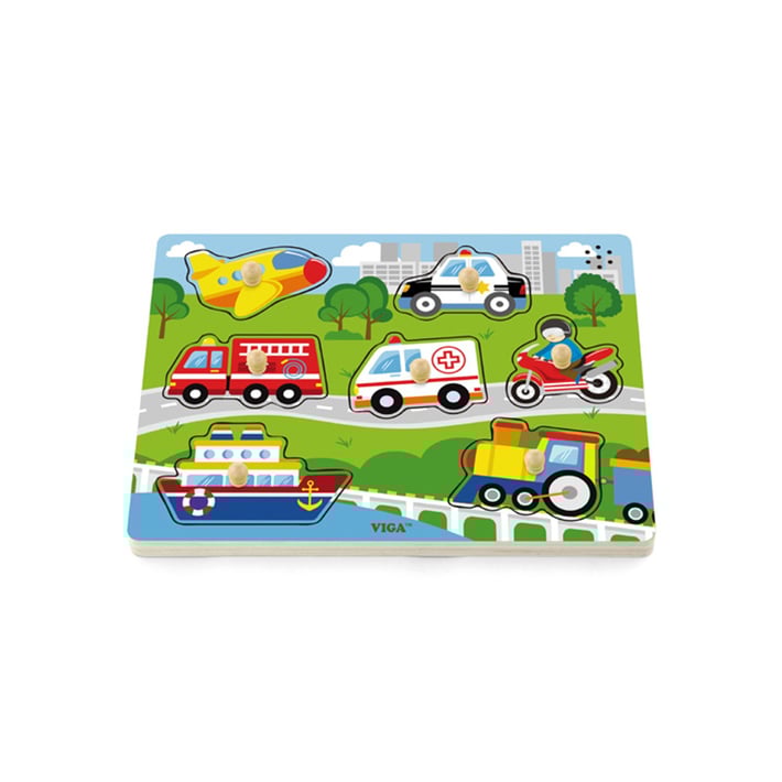 - 7 пъзела с дръжки (самолет, полицейска кола, пожарна кола, линейка, мотоциклет, кораб, локомотив).