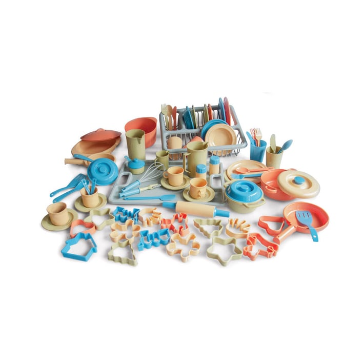 Комплект от 86 елемента. Сред тях: сервиз за чай, сервиз за хранене, комплект за готвене и печене, прибори за хранене, чаши и чинии.