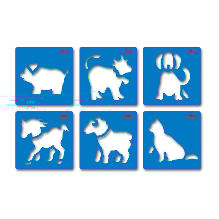 Шаблон с 6 различни мотива на животни от фермата – кон, крава, прасе, овен, котка, куче.