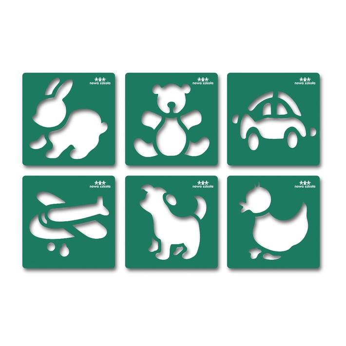 Шаблон с 6 различни мотива: заек, куче, мечка, самолет, кола, патица.