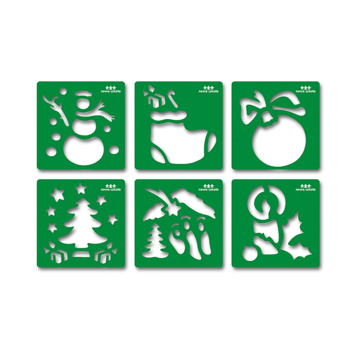 Шаблон с 6 различни коледни мотива – снежен човек, елха, чорап, свещ, коледна играчка, сцена на Рождество.