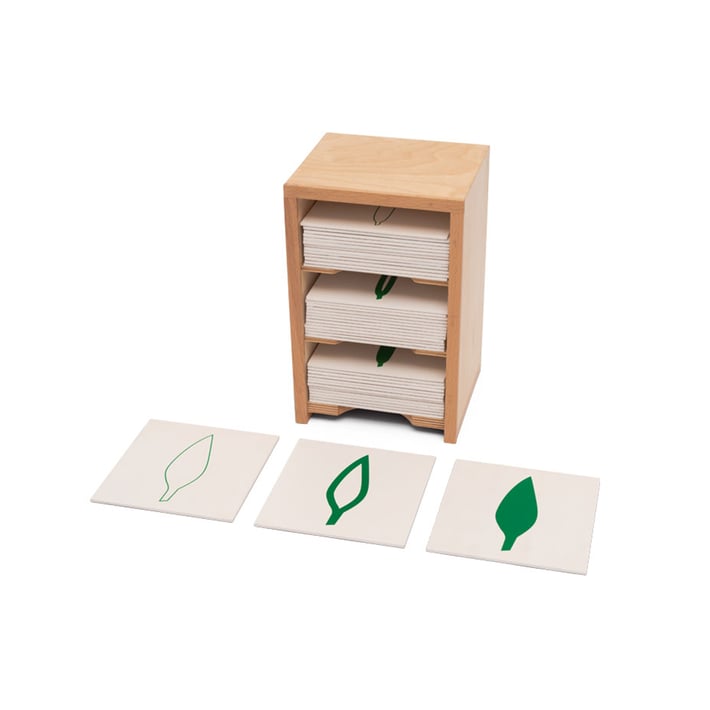 42 карти в 3 версии, изобразяващи листата: на горния рафт на шкафа са поставени карти с оцветени листни форми, на средния рафт - листни форми с дебел контур, а последният рафт – листни форми с тънък контур.