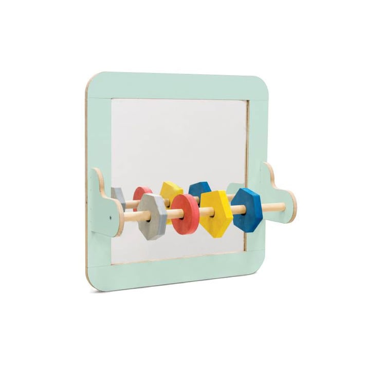 Към огледалото е прикрепена лента, върху която са фиксирани подвижни цветни форми (кръг, петоъгълник, шестоъгълник и седмоъгълник).
