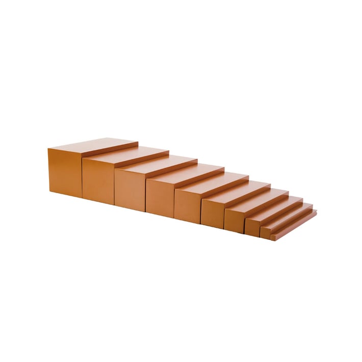 10 кубоидни блока с височина 20 cm и изработени от масивно кафяво дърво с лаков ефект.