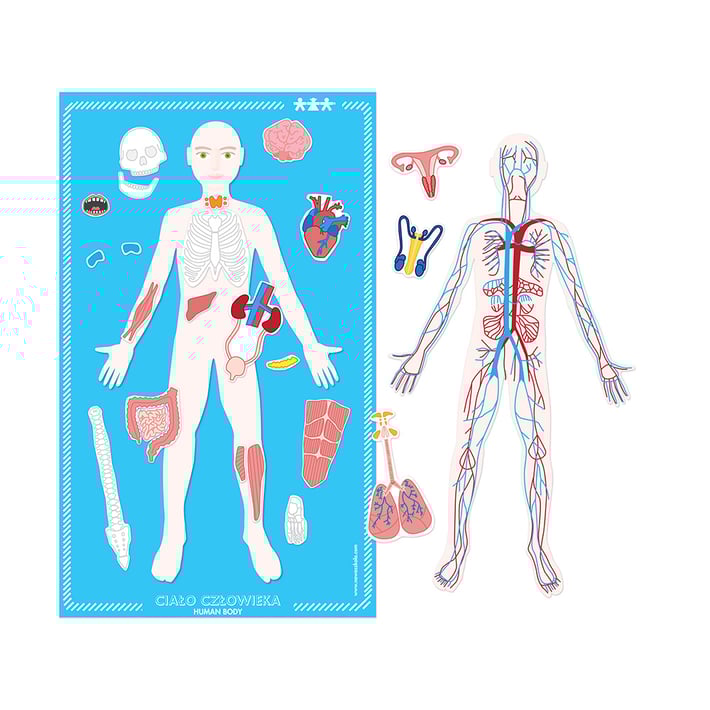 Комплектът включва: 1 голяма магнитна дъска 100 х 60 cm; 16 магнита с имена на системите на човешкото тяло (на английски и полски); 69 магнита с изображения на части от човешкото тяло; кутия, наръчник за употреба.