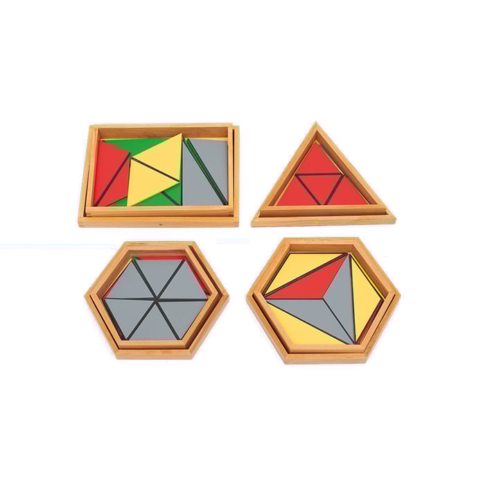 Четири кутии, съдържащи триъгълници за конструиране с правилни и неправилни плоски фигури и модели. Триъгълниците трябва да бъдат подредени въз основа на техния цвят или черни линии по страните им.