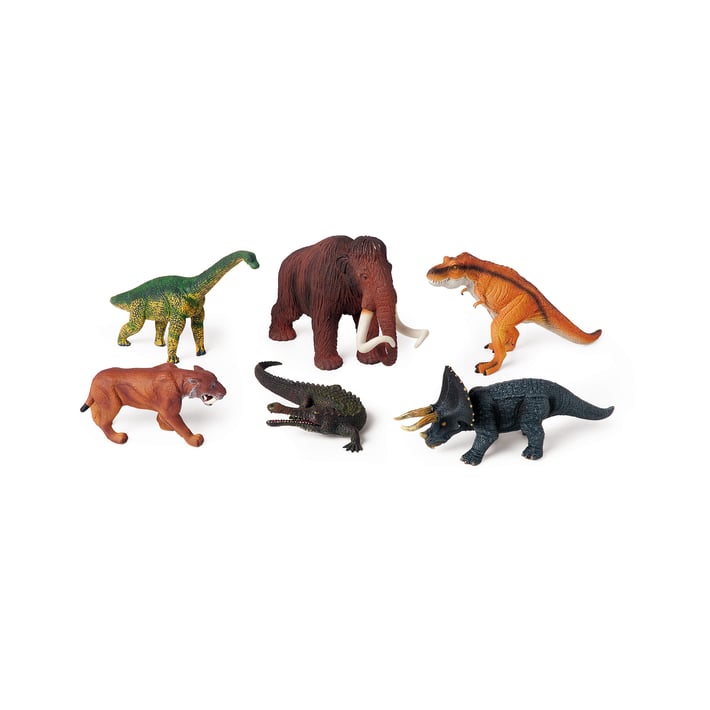 Комплектът от праисторически животни съдържа: Т-рекс, трицератопс, брахиозавър, смилодон, саркозух, мамут;