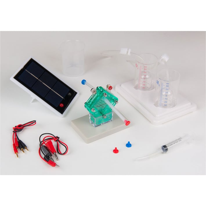Комплектът за демонстриране на принципите на съхранение и преобразуване на енергия чрез горивна клетка, се състои от: