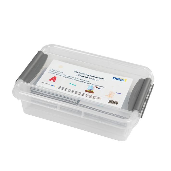 Комплектът съдържа 5 малки сини и 5 малки червени магнита и 64 пълноцветни магнити с букви, думи и звукови вериги.