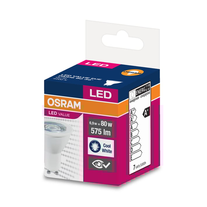 • LED крушка Osram с цокъл GU10 и мощност 6.9W, осигуряваща яркост от 575 lm.