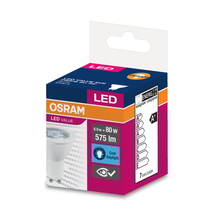 Мощна LED крушка Osram с цокъл GU10 и мощност 6.9W, осигуряваща висока яркост от 575 lm.