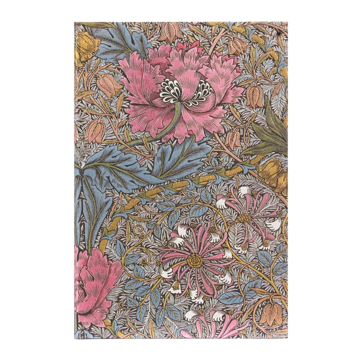 Уилям Морис смята, че всяка декорация е безполезна, когато не напомня за нещо отвъд себе си. Той е искал да използва естествени багрила в текстилната си продукция, както се вижда в тази розова и пастелна версия на неговия дизайн на печатан памук Honeysuckle.