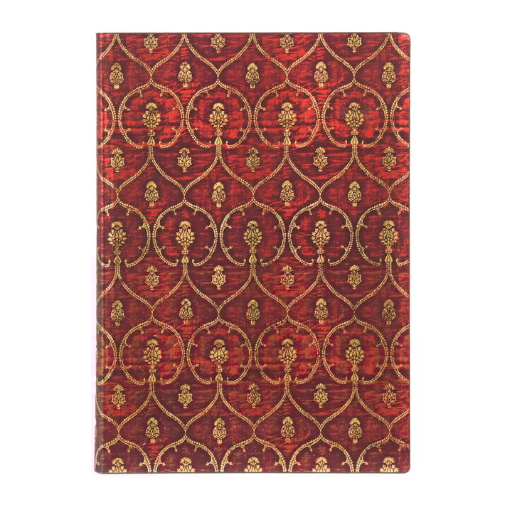 Червено кадифено усещане се носи от дизайна на този тефтер от Paperblanks, вдъхновен от далматика от XV в. – широка туника с широки ръкави, носена от британски монарси по време на церемонии. Тези дрехи са били тъкани по специална технология, която правила кадифето още по-меко и го превръща в най-луксозните тъкани през Ренесанса. Оригиналното кадифено пано, възпроизведено тук, е подарено на музея Метрополитън, а някога е било собственост на унгарски финансист, колекционер и търговец на произведения на изкуството. Изработено е от брокатени позлатени метални нишки в седемлъчев щит, очертан със сълзички, ботаническа форма, подобна на артишок и дребни флорални мотиви.