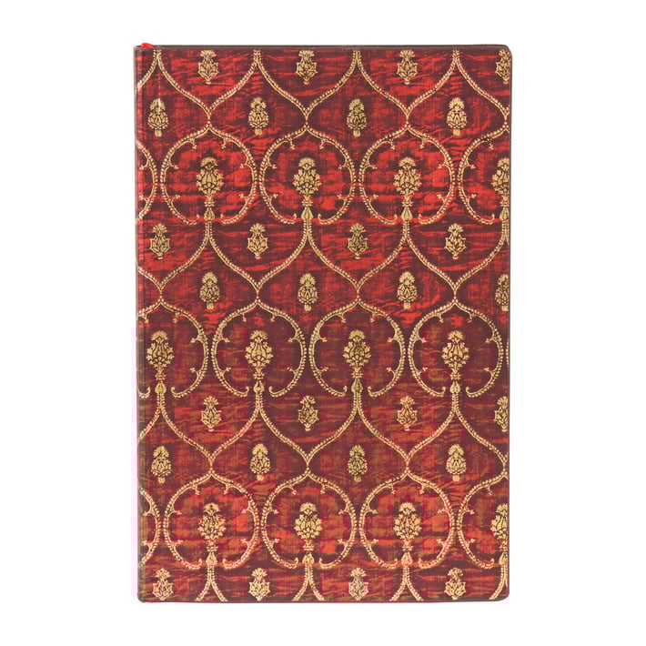 Червено кадифено усещане се носи от дизайна на този тефтер от Paperblanks, вдъхновен от далматика от XV в. – широка туника с широки ръкави, носена от британски монарси по време на церемонии. Тези дрехи са били тъкани по специална технология, която правила кадифето още по-меко и го превръща в най-луксозните тъкани през Ренесанса. Оригиналното кадифено пано, възпроизведено тук, е подарено на музея Метрополитън, а някога е било собственост на унгарски финансист, колекционер и търговец на произведения на изкуството. Изработено е от брокатени позлатени метални нишки в седемлъчев щит, очертан със сълзички, ботаническа форма, подобна на артишок и дребни флорални мотиви.