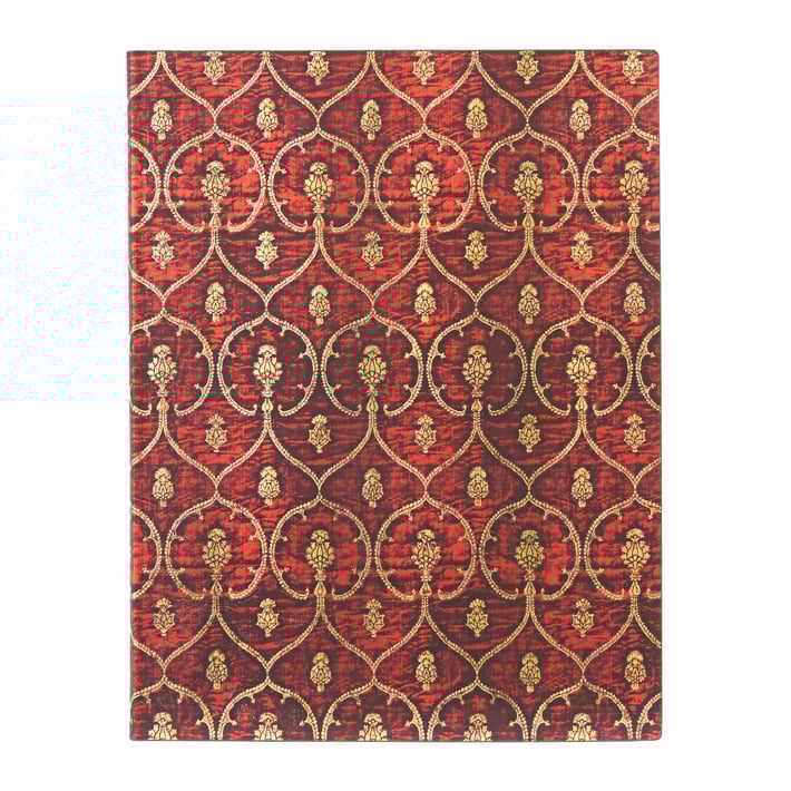Червено кадифено усещане се носи от дизайна на този тефтер от Paperblanks, вдъхновен от далматика от XV в. – широка туника с широки ръкави, носена от британски монарси по време на церемонии. Тези дрехи са били тъкани по специална технология, която правила кадифето още по-меко и го превръща в най-луксозните тъкани през Ренесанса. Оригиналното кадифено пано, възпроизведено тук, е подарено на музея Метрополитън, а някога е било собственост на унгарски финансист, колекционер и търговец на произведения на изкуството. Изработено е от брокатени позлатени метални нишки в седемлъчев щит, очертан със сълзички, ботаническа форма, подобна на артишок и дребни флорални мотиви.