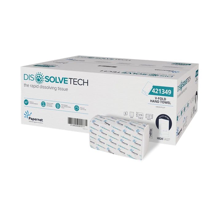 Сгънатите кърпи Dissolve Tech са изработени от двуслойна, чиста целулозна хартия.Те отговарят на екоетикета на ЕС и FSC сертификата.Съвместими са с антибактериалния диспенсър HIGHFAST®.Релефно щамповане: Wave.