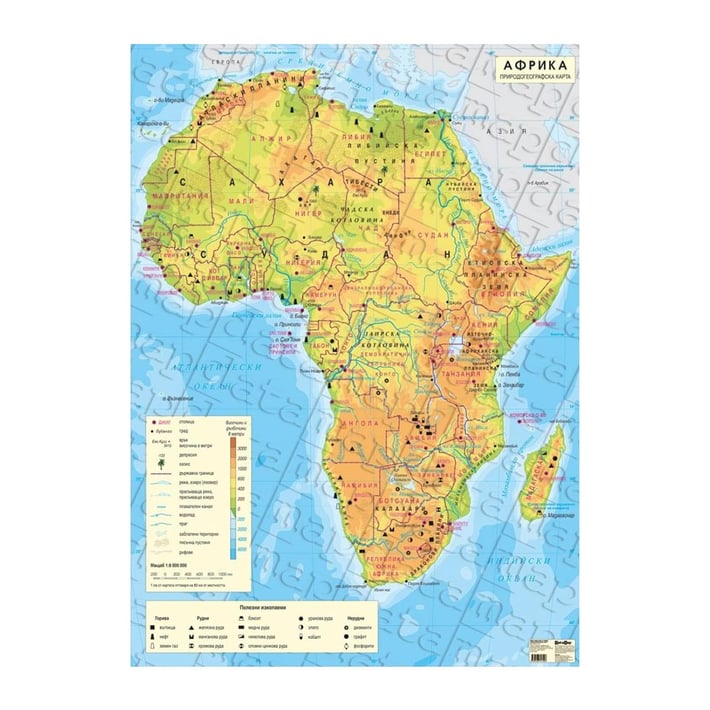 Природогеографска карта на Африка, одобрена от МОН. Двустранно ламинирана, с пластмасови лайсни и шнур на горна лайсна за окачване на стена.Подходяща за дълготрайна употреба. Изработена за добра четимост от далечно разстояние.Съдържа: