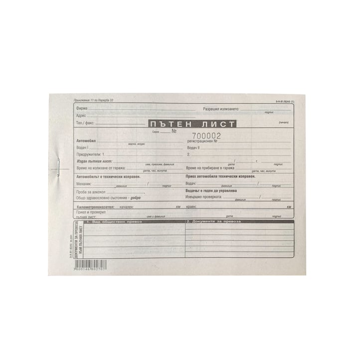 Пътен лист, A5, приложение 11 по наредба 33