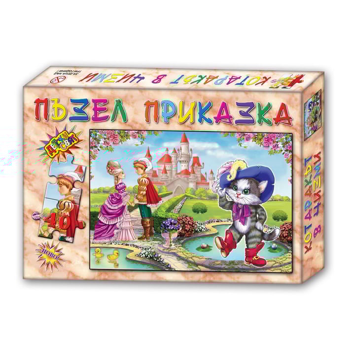 В кутията има пъзел с 40 елемента с картинка от приказката "Котаракът в чизми" и написаната приказка.