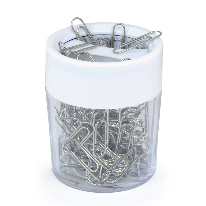Компактна магнитна поставка за кламери, изработена от прозрачна пластмаса с цветен капак.