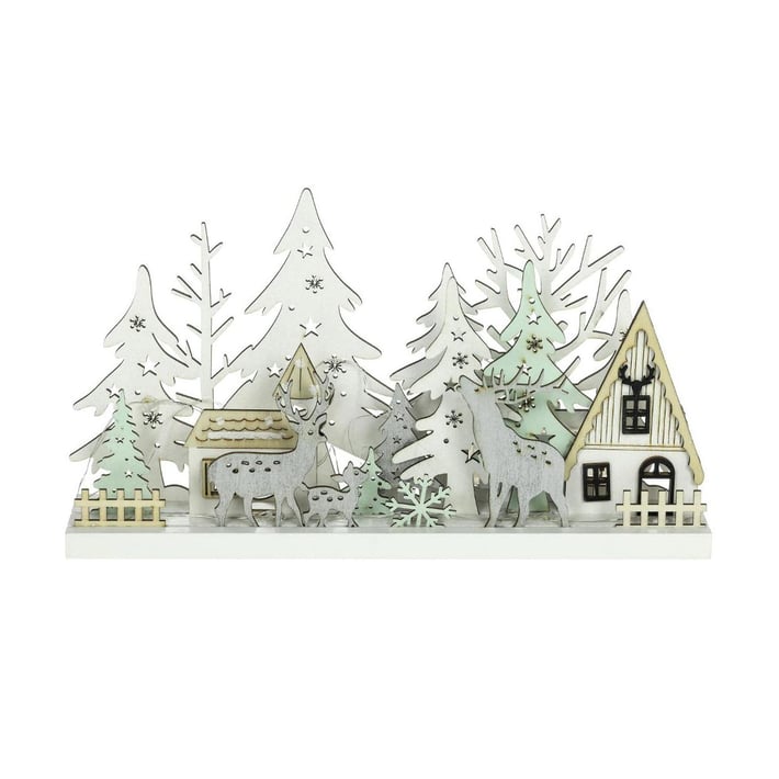 Моделът изобразява миниатюрна зимна сцена с дървета и елени, осветена от 15 LED диода в топла бяло светлина, които създават уютна и празнична атмосфера.