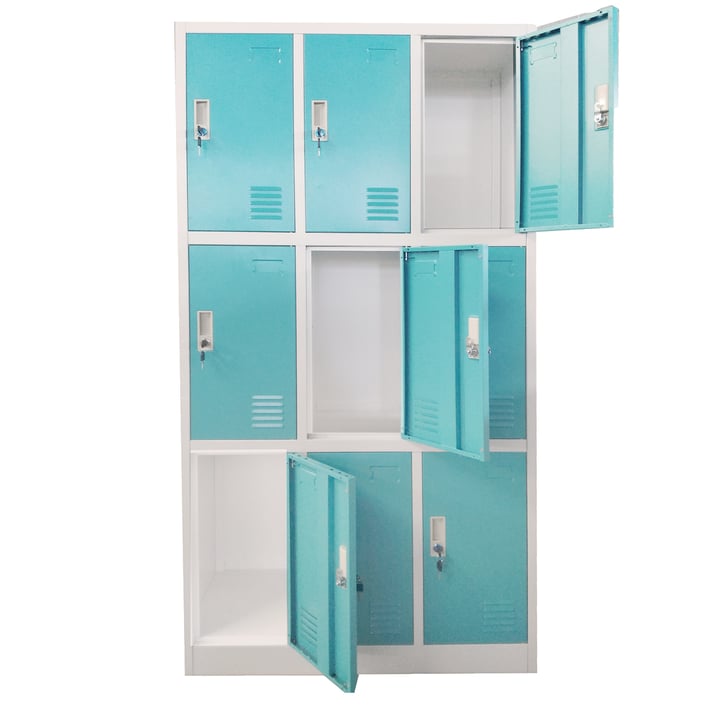 Гардероб RFG, метален, троен, с девет клетки, 90 x 45 x 185 cm, сив корпус, врати с тюркоазен цвят
