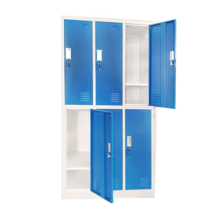 Гардероб RFG, метален, троен, с шест клетки, 90 x 45 x 185 cm, сив корпус, врати със син цвят