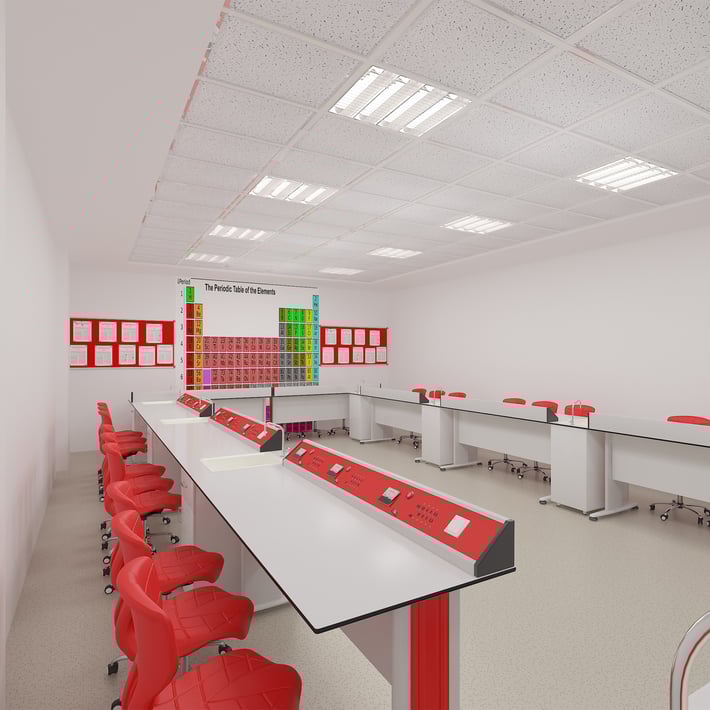 Кабинет по физика RFG Flat, над VII клас, за 24 ученика, HPL плот, бяло-червен