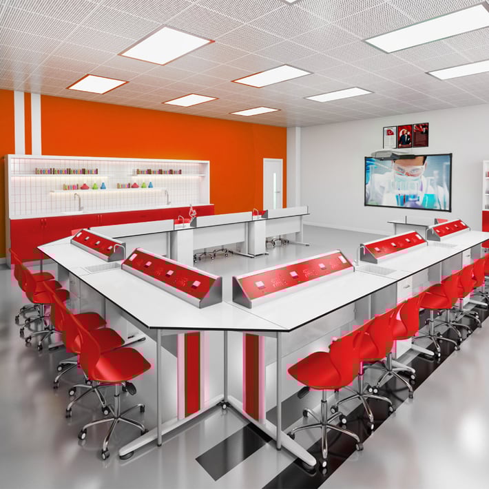 Кабинет по химия и биология RFG Flat, над VII клас, за 24 ученика, HPL плот, метални крака, бяло-червен
