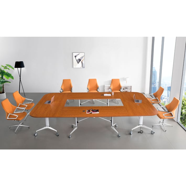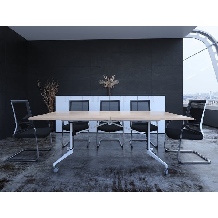 Конферентна маса RFG Butterfly, мобилна, сгъваема, 200 x 100 x 74 cm, правоъгълен плот, ПДЧ 18 mm, кехлибарен дъб, бели метални крака