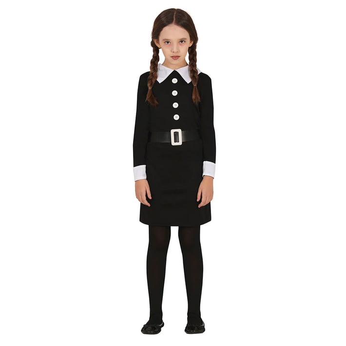 Стилна черна рокля, специално разработена за деца на възраст 10–12 години, подходяща за карнавални празненства, тематични партита, сценични изпълнения и училищни мероприятия. Изработена е от 100% полиестер, който е лек, удобен за носене и устойчив при многократна употреба.Роклята се отличава с елегантна яка, която придава изискан и завършен вид, комбиниращ класически стил с модерна визия. Дължината и кройката са съобразени с комфорта на детето, осигурявайки му свобода на движение по време на игри и празнични активности.Този модел е идеален избор за деца, които искат да се отличат с изчистена и стилна карнавална визия, съчетавайки удобство и празнично присъствие.