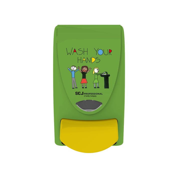 Ярко оцветена система за дозиране, която насърчава миенето на ръцете.