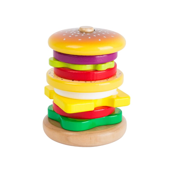 Вкусен бургер за подреждане! Може да гарнирате бургера с различни съставки, а със заобленото дъно може да постигнете ефекта на клатеща се кула. Играта насърчава развитието на двигателните умения и въображението.