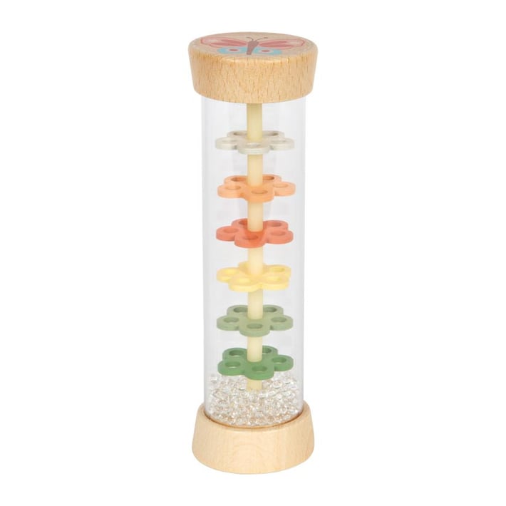 Little Friends внася магията на дъждовните капки директно в детската стая – визуално и акустично! Малките топчета вътре в пръчката за дъжд създават приятно, нежно потракване, напомнящо падащ дъжд, докато се стичат през шест цветни перфорирани пластини във формата на цветя.