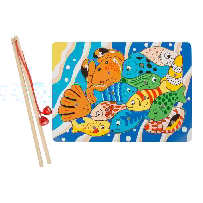 Забавна дървена игра, с която децата ловят рибки с магнитна въдица.