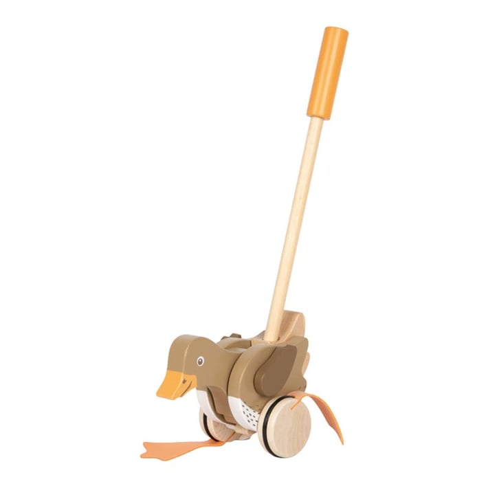 Играчката е част от категорията дървени играчки за бутане, които насърчават координацията и баланса. При движение главата на патето се поклаща, което забавлява децата и ги мотивира да продължат да се движат. Благодарение на стабилната дървена дръжка, малките ръчички лесно ще контролират играчката, развивайки едновременно фината моторика и мускулния тонус.