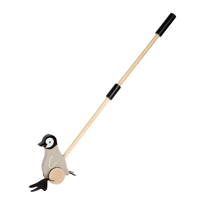 Играчката е част от категорията дървени играчки за бутане, които насърчават развитието на баланса и двигателните умения. При движение пингвинът се поклаща леко, което добавя допълнително забавление и мотивира детето да продължи да се движи. Дръжката е удобна за хващане, а здравите дървени колела осигуряват плавно и безопасно бутане.
