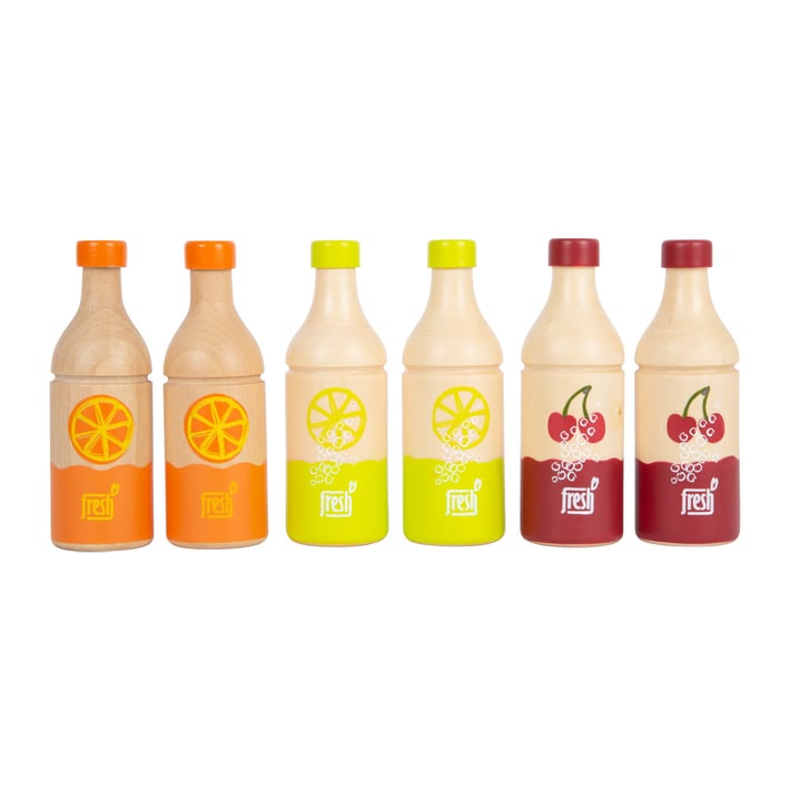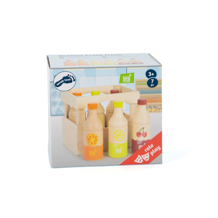 Тази дървена щайга съдържа шест бутилки, изработени от масивно дърво. Тя е идеалното допълнение към детската кухня или магазин за игра. Благодарение на семплите илюстрации, бутилките са лесни за разбиране дори от по-малките деца.